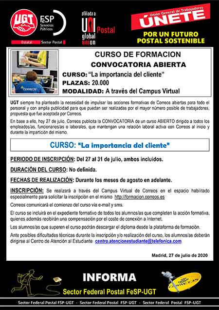 UGT siempre ha planteado la necesidad de impulsar las acciones formativas de Correos abiertas para todo el personal y con amplia publicidad para que puedan ser realizadas por el mayor número posible de trabajadores, propuesta que fue aceptada por Correos.